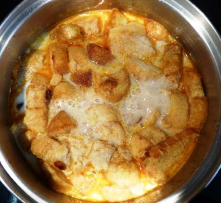 hecha con leche, una canela en rama, moka de sal, grasa de capón y pan seco del